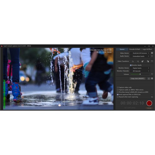 Captures NDI, streaming-media, USB Cameras, Blackmagic I/O, Z-CAM, Phone Screen Cast. Supports file split (1m -3h), record pause/continue, Multichannel Audio, Snapshots, dump h.264/h.265 streams and more. Supports edit-while-capture (growing files), together with EDIUS 9-11 Workgroup/Broadcast versions.